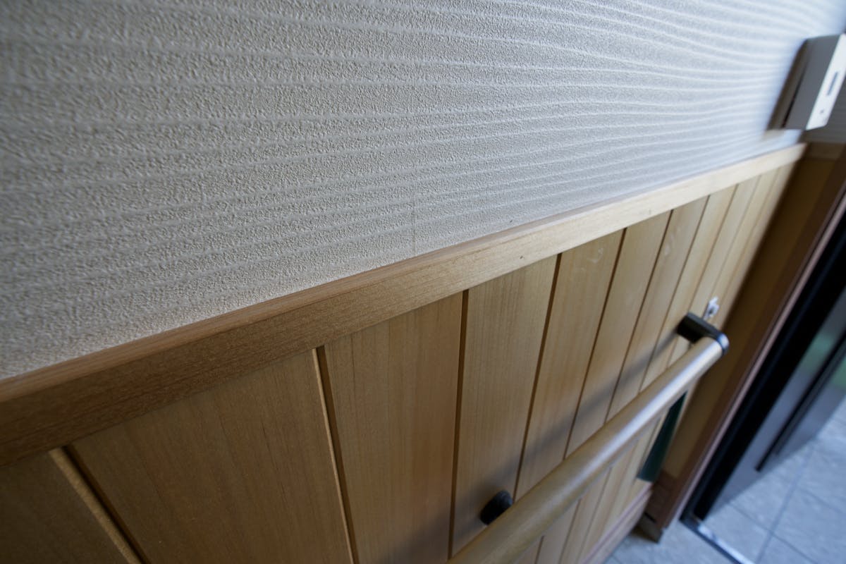 室内にはアガチスの羽目板を採用し、腰壁を施工しています。