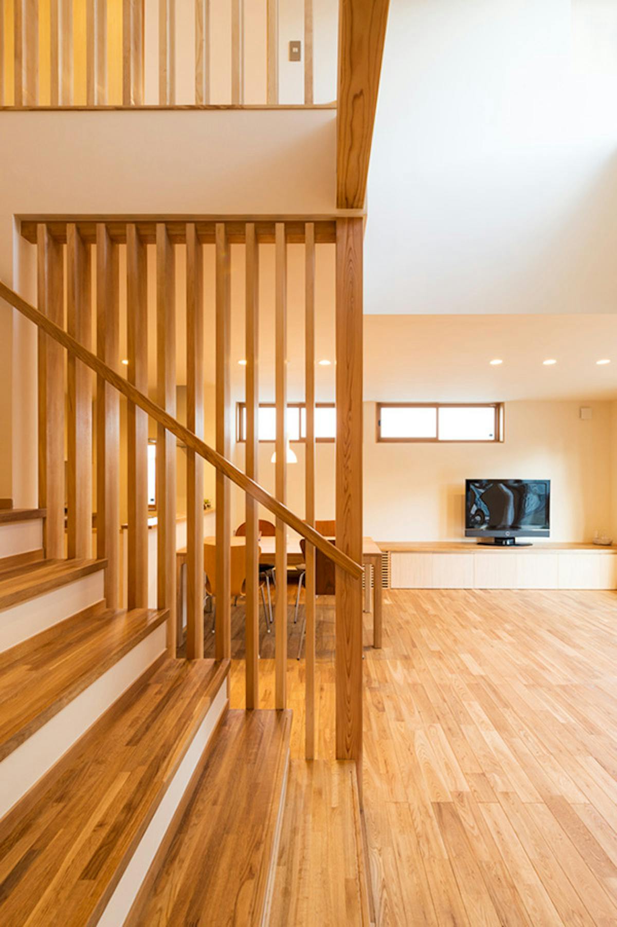新潟県・個人住宅 階段と2階の格子にアガチスを使用しました。おだやかな木目が他の樹種の良さを引き立たせています。