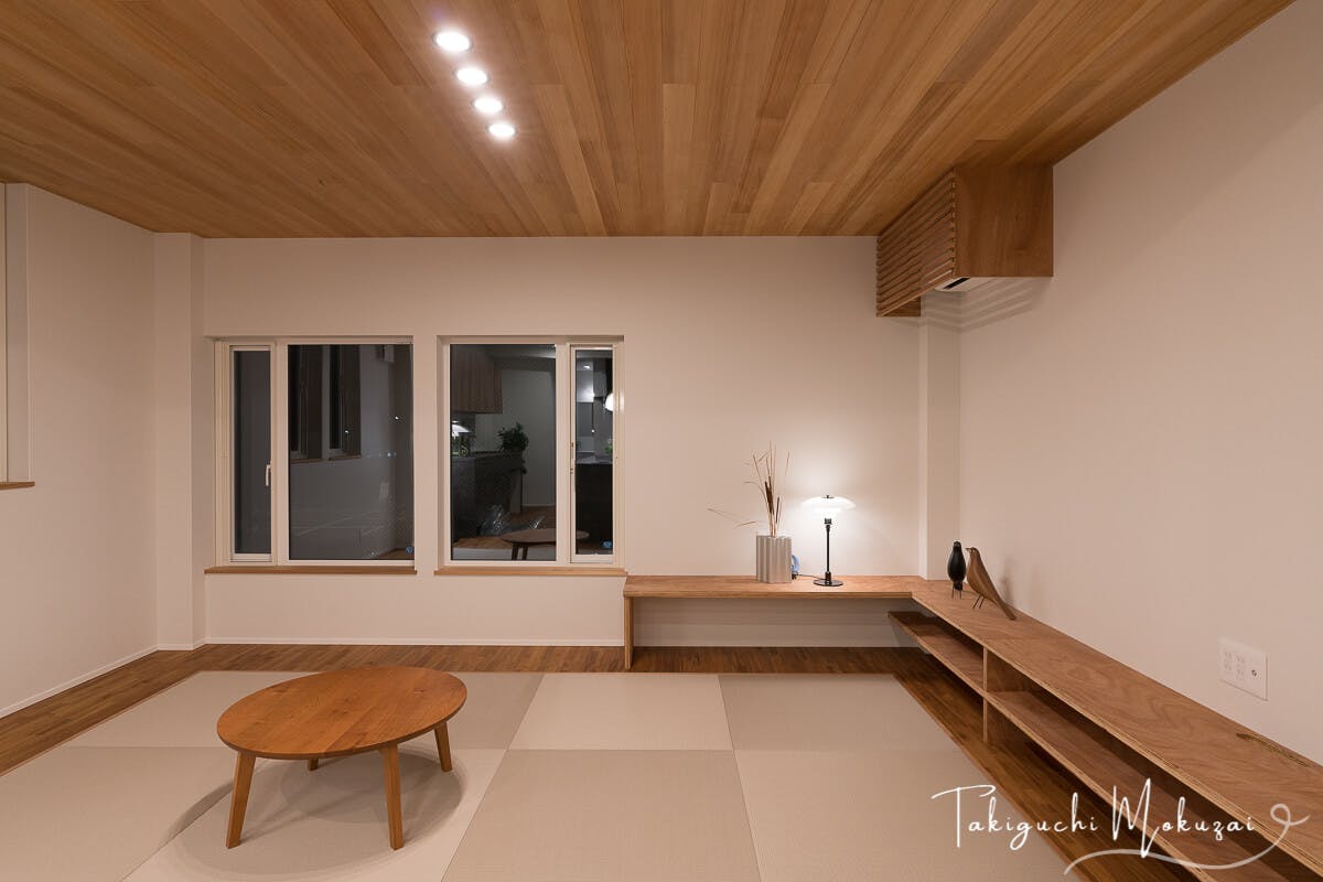 新潟県・個人住宅 広々とした窓枠と小上がり和室の枠にアガチス羽目板をご採用頂きました。窓枠、小上がり和室の枠のほか、建具枠にもアガチスが使用されています。